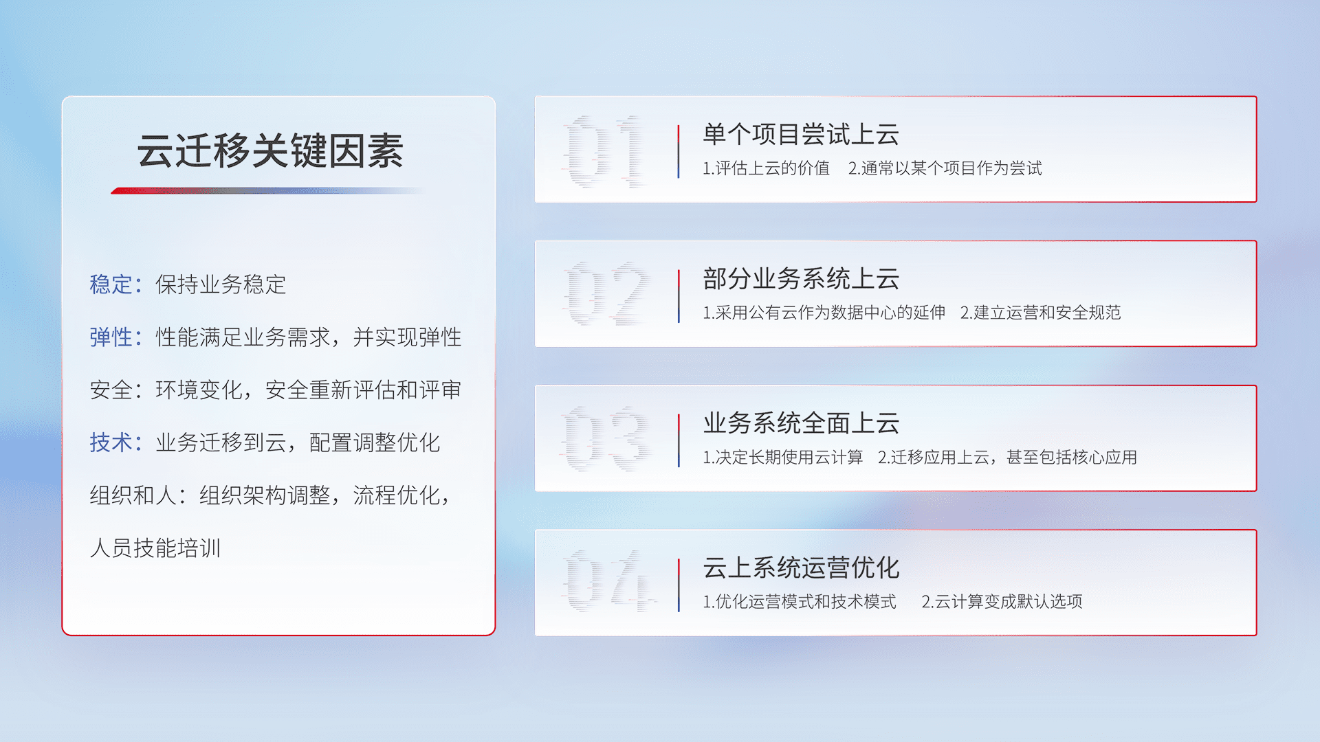 结合实际业务,,从规划设计、、、云平台选型、、、、云原生改造、、、数据迁移、、、集成交付,,,迁移全过程为客户识别最佳上云路径,,,,做好风险识别管理,,设计网络架构、、身份权限、、、安全审计合规、、、、操作审计、、、日志审计、、、、监控告警策略、、、、多站点容灾设计等,,,对云上基础设施进行整体规划,,,提升IT治理水平,,,,以满足弹性、、、、高可用、、高性能的需求。。